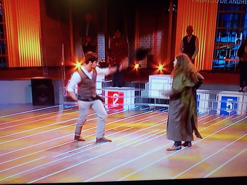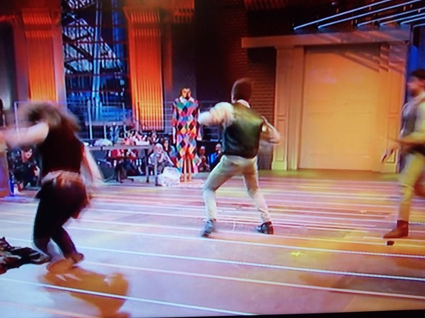 Jamal si è poi esibito, assieme ad altre controfigure e ad Amadeus, in una esibizione che ricordava una rissa in stile western.