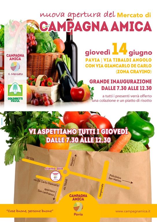 Diventano quattro i mercati di Campagna Amica a Pavia. Giovedì 14 giugno 2018 sarà inaugurato un nuovo mercato degli agricoltori nella zona di Pavia Ovest. Un nuovo punto di riferimento per tutti coloro che vogliono il meglio dell’agricoltura pavese direttamente in città, un nuovo mercato di vendita diretta che arriva dopo quelli di Coldiretti già attivi in Centro (piazza del Carmine, il mercoledì e il sabato mattina) e al quartiere Vallone (via Pastrengo, il sabato mattina).