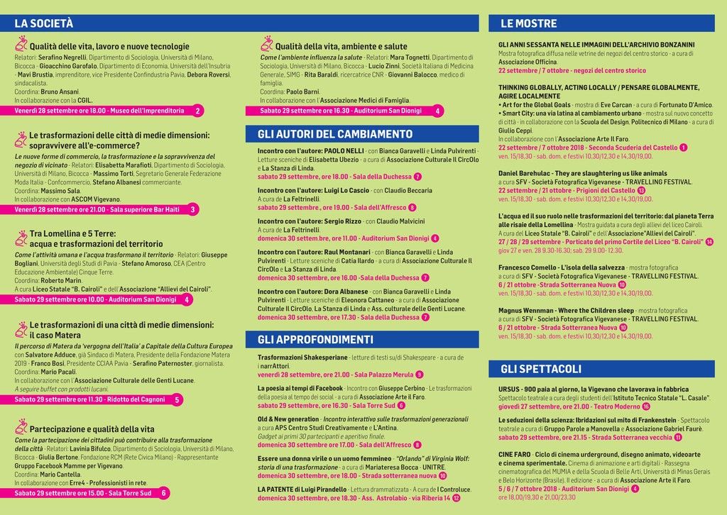 La suggestiva storica città di Vigevano (a circa 30 Km da Milano), che vide i natali o anche solo il passaggio di numerosi personaggi che furono spesso lettori e ispiratori di cambiamenti e trasformazioni (sopra a tutti ricordiamo Lucio Mastronardi, Eleonora Duse e Leonardo da Vinci), ospita per il secondo anno il Festival delle Trasformazioni.