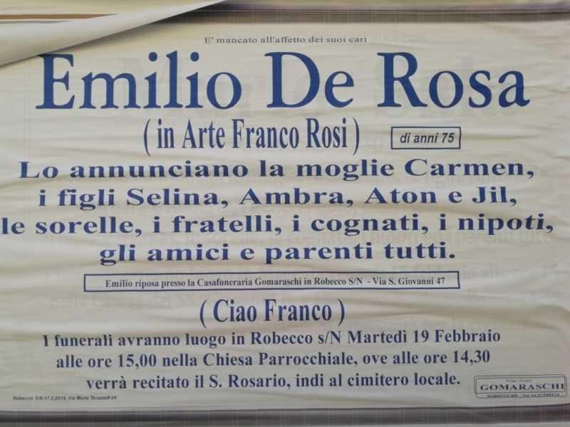Ha trascorso gli ultimi anni della sua vita a Cascinazza di Robeccco, Emilio De Rosa, noto nel mondo dello spettacolo come Franco Rosi. Morto ieri all’ospedale di Magenta, Franco Rosi è stato ricordato da tutta la stampa nazionale. Le sue esequie funebri saranno celebre domani a Robecco.
