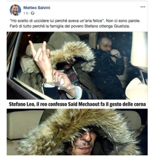 “Ho scelto di uccidere lui perché aveva un’aria felice. Non ci sono parole. Farò di tutto perché la famiglia del povero Stefano ottenga Giustizia”. Questo il messaggio comparso sulla pagina Facebook ufficiale del Ministro dell’Interno del governo, Matteo Salvini. Il commento ai fatti legati alla tragedia di Stefano Leo, ha ottenuto migliaia di condivisioni, mi piace e commenti, spesso molto sopra le righe pur di fronte ad una confessione drammatica.