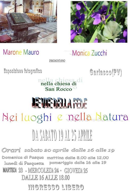 Tema: "La Fede e la Natura in genere" riferendosi a quanto detto recentemente Papa Francesco in un'enciclica sul rispetto dell’ambiente. Dal pomeriggio del sabato di Pasqua fino a giovedì 25 aprile la mostra sarà visitabile. L’Ingresso è gratuito Presso la settecentesca di San Rocco di Garlasco originaria del XVI secolo, che si trova alle spalle della chiesa parrocchiale già a Natale Marone e Zucchi sono stati protagonisti di una esposizione con scatti di luoghi sacri locali e non.