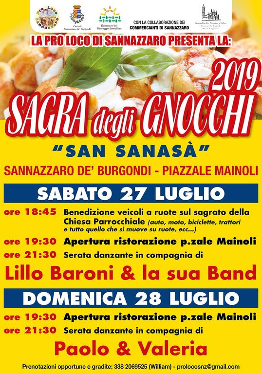 A Sannazzaro de' Burgondi, sabato 27 e domenica 28 luglio, torna l'appuntamento con la Sagra degli gnocchi "San Sanasà", organizzata dalla Pro loco. Sabato 27: benedizione dei veicoli sul sagrato della Chiesa Parrocchiale, a seguire servizio ristorante dalle 19:30 e serata danzante con Lillo Baroni e la sua band. Domenica 28 luglio musica in compagnia di Paolo e Valeria. Info 338 20 69 525, prolocosnz@gmail.com.