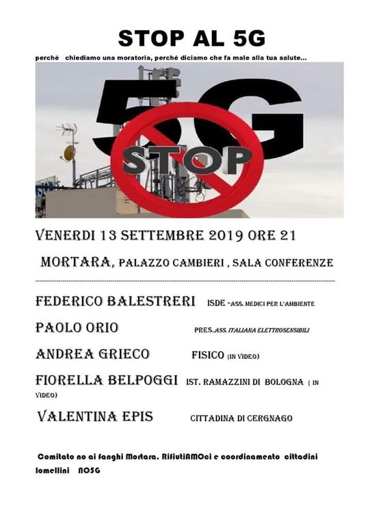Interverranno attraverso collegamenti video il fisico Andrea Grieco e la dottoressa Fiorella Belpoggi dell’istituto Ramazzini di Bologna. I tre gruppi che stanno organizzando l’evento hanno già esteso l’invito a tutta la cittadinanza, sottolineando che la partecipazione sarà libera e gratuita.