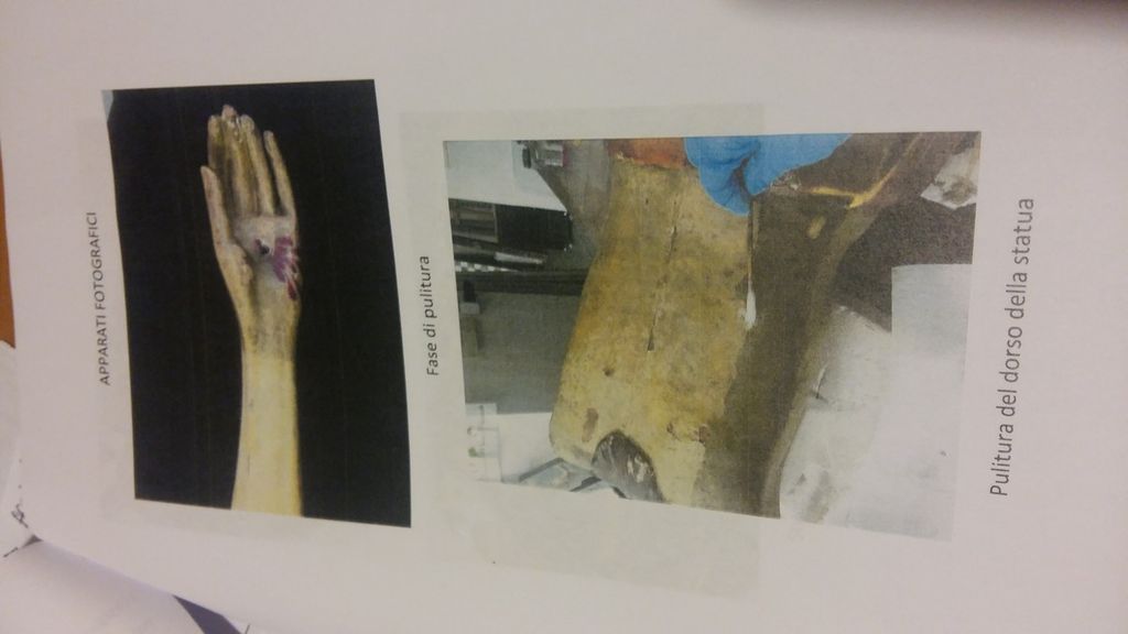 Hanno continuato spiegandoci i principali ritocchi da loro realizzati sulla scultura: "in accordo con il funzionario della Soprintendenza la Dott.ssa Benedetta Chiesi siamo intervenuti in maniera conservativa. Dopo la rimozione di depositi di polvere e sostanze inquinanti ci siamo concentrati sulle fratture e i sollevamenti di scaglie di colore senza tuttavia intaccare il precedente restauro ottocentesco".