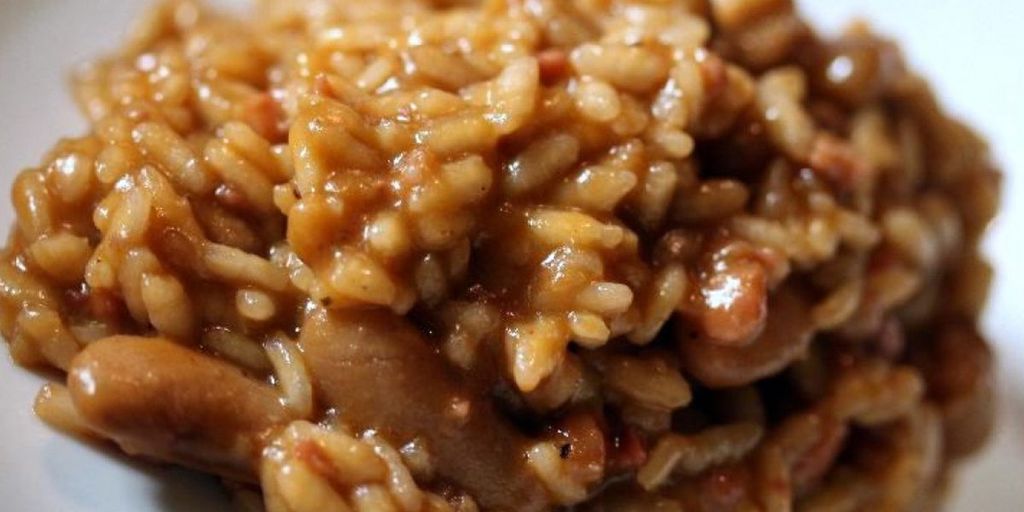 Lasciare insaporire, quindi aggiungere il riso; tostare, sfumare con il vino e lasciarlo completamente evaporare. Bagnare con il brodo e aggiungere tutti i fagioli e la foglia di alloro. Cuocere a fuoco moderato per circa 12 minuti, aggiungendo eventualmente brodo, se necessario.