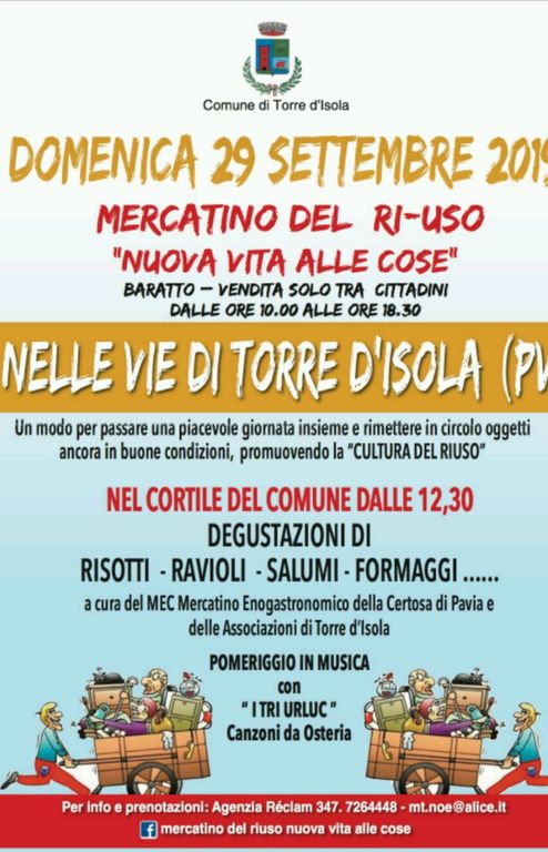 Oggetti che conquistano una seconda, terza e anche una quarta vita: è la magia dei mercatini delle pulci, mercatini del ri-uso, del vintage che piace sempre di più. Domenica 29 Settembre l’appuntamento è a Torre d’Isola per una giornata di festa: a partire dalle 10, i colori, le forme, gli oggetti dalle molteplici vite in vendita al Mercatino del Ri-Uso – Nuova Vita alle Cose animeranno le vie del centro ed il cortile del Comune. La manifestazione, ideata dall’Agenzia Reclam in collaborazione con il Comune di Torre d’Isola, si sarebbe dovuta tenere domenica scorsa ma gli organizzatori hanno preferito, a causa delle pessime previsioni meteo, rinviarla all’ultima domenica di Settembre.