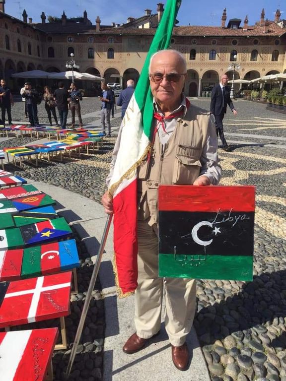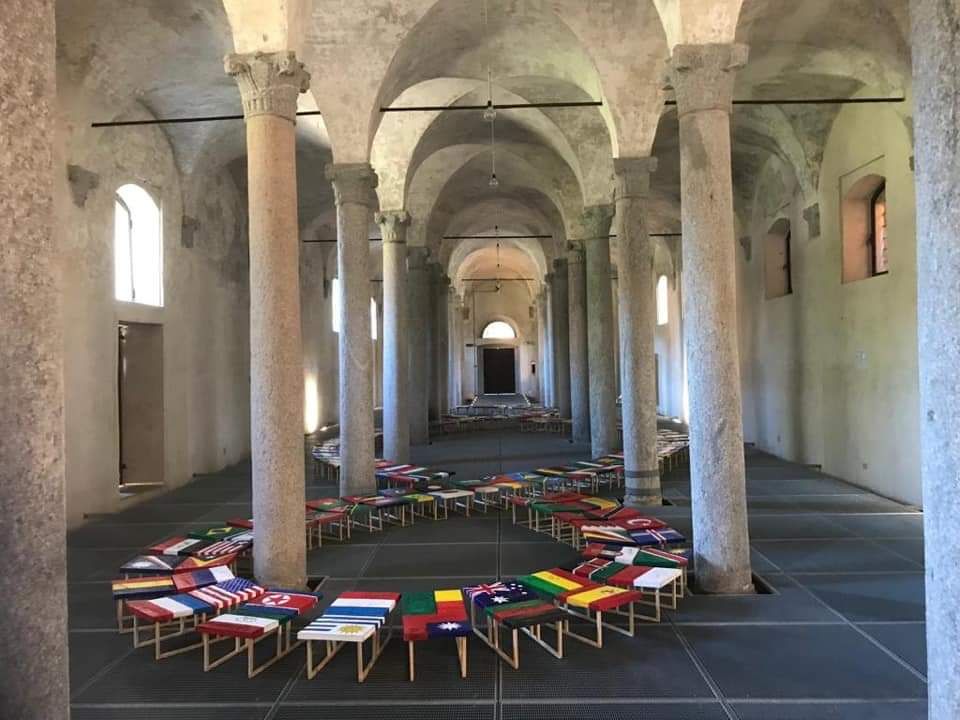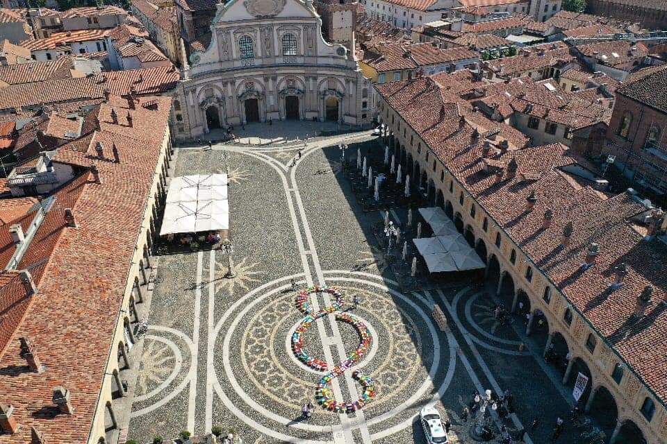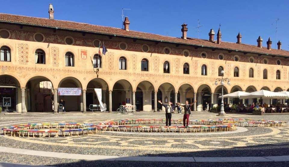 Dopo essere stata ospitata a Roma, Milano, Matera e Monza, "La Bandiera del Mondo 1+1=3", è stata presentata a Vigevano in Piazza Ducale lunedì pomeriggio, e descritta dagli artisti nella successiva conferenza in Sala dell'Affresco alla presenza di autorità ed ospiti.