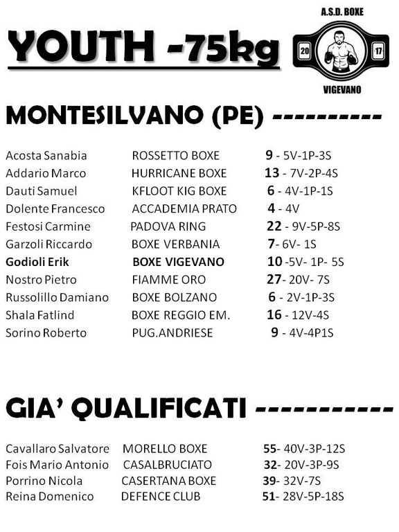 Da questi undici nomi ne usciranno quattro che prenderanno parte ai campionati italiani insieme ad altri quattro pugili che hanno già ottenuto il pass grazie ai loro record di incontri (Salvatore Cavallaro, Mario Antonio Fois, Nicola Porrino, Domenico Reina).