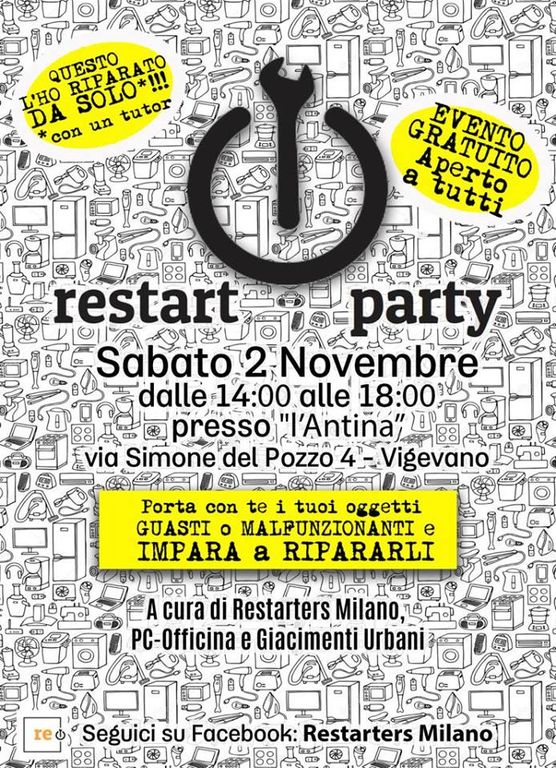 Chi intende partecipare al restart party potrà passare da L’Antina (Via Simone del Pozzo 4, Vigevano) il 2 novembre a qualsiasi ora del pomeriggio, tra le 14 e le 18, e sarà chiamato a seguire e a partecipare attivamente all'intervento di riparazione: i restart party, adatti per questo anche a bambini e ragazzi, non sono infatti pensati come servizi di riparazione gratuita ma come processi di apprendimento collaborativo, durante i quali condividere informazioni, competenze e soluzioni.