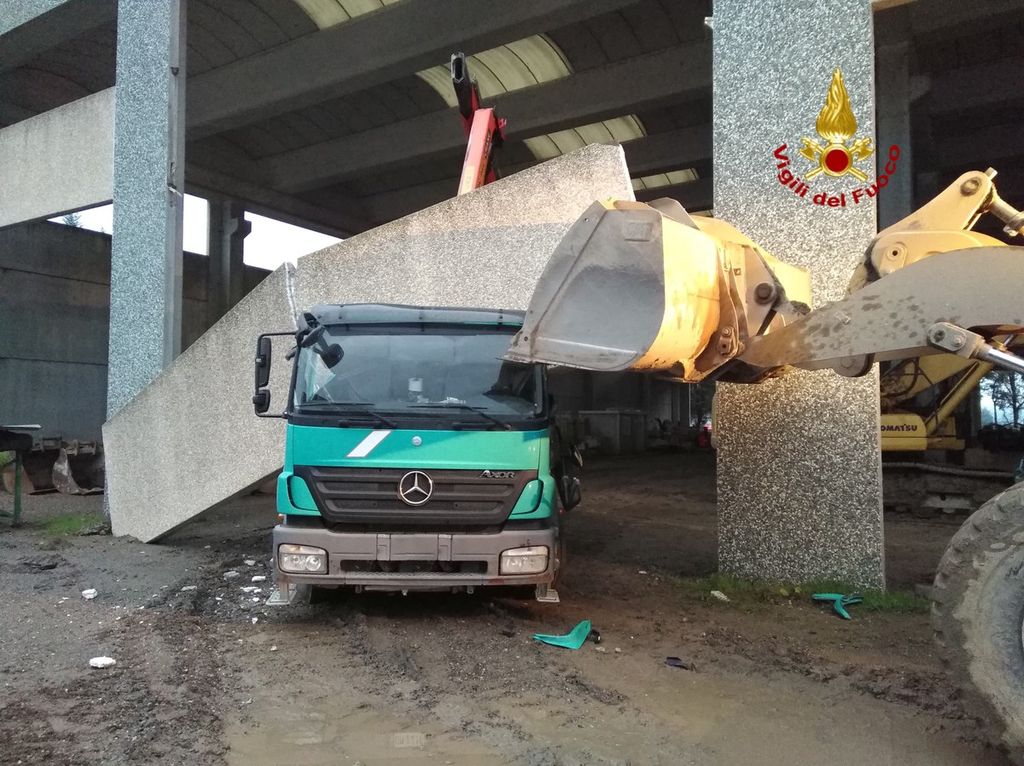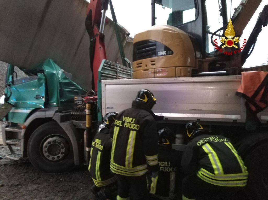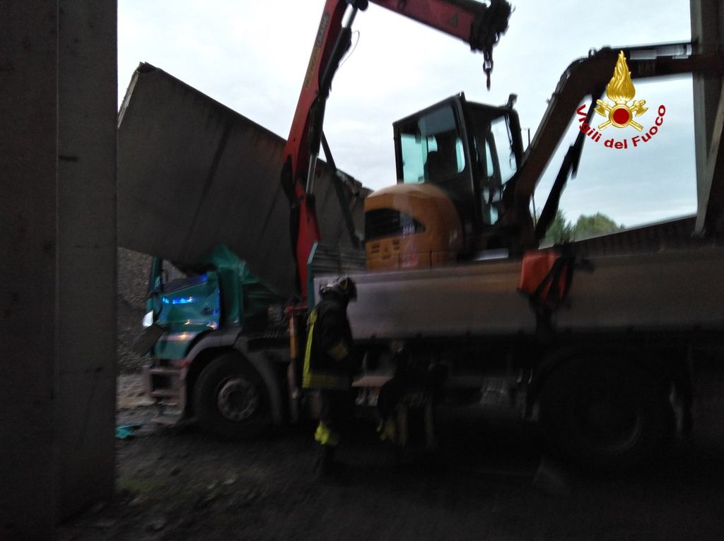 L'autista, un uomo di 57 anni rimasto incastrato nell'abitacolo, è stato estratto in buone condizioni di salute dai vigili del fuoco. Le operazioni hanno richiesto la messa in sicurezza con una pala gommata che ha impedito un eventuale ulteriore cedimento del trave.