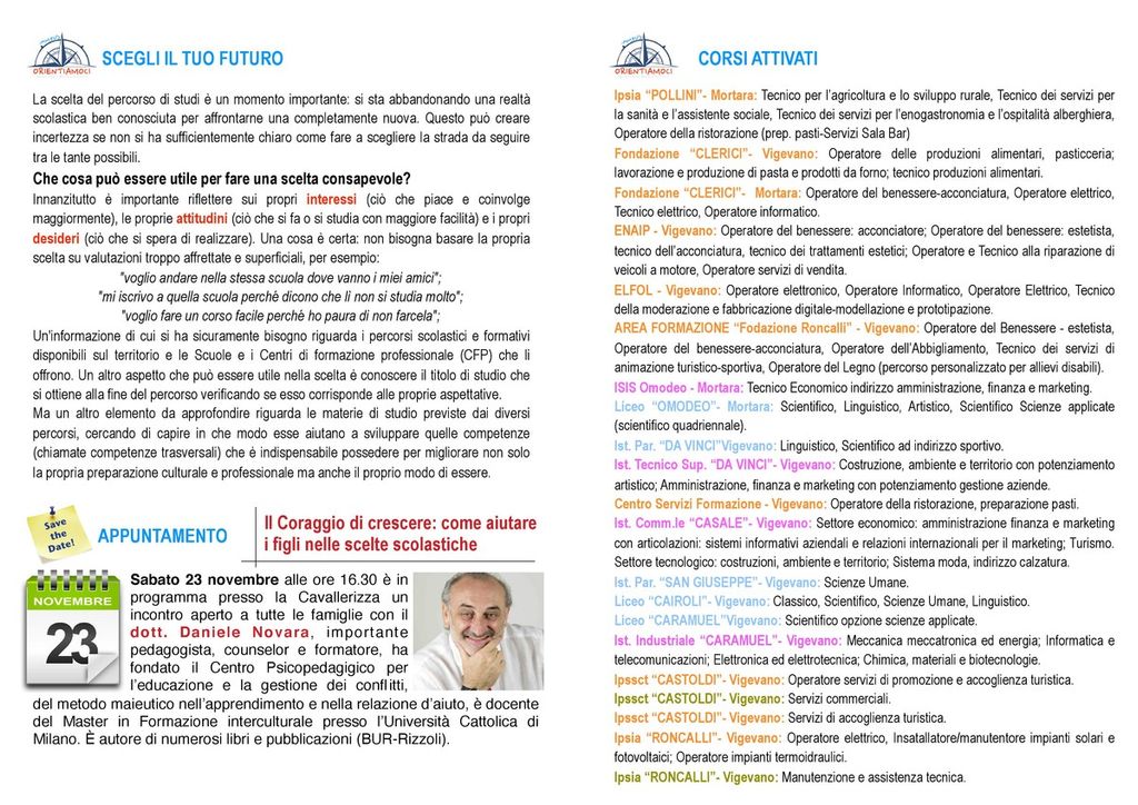 Nel pomeriggio di sabato 23 novembre vi sarà l'incontro aperto con i genitori ed il pedagogista Daniele Novara.