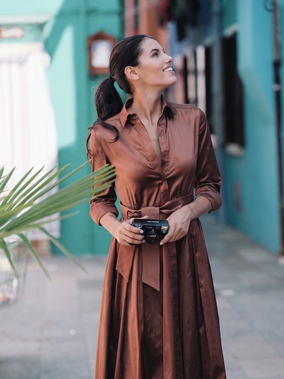 Qui la protagonista è a fuoco in un avvolgente abito lungo color rosa ma, sullo sfondo, la città lagunare regala un romanticismo che emoziona. A Murano il set va da Carolina in paillettes nella fornace di una vetreria per novembre, alla Miss sul pontile con la corona per la foto di settembre, e l’affascinante Laguna in lontananza. A Burano, tra le case colorate che richiamano milioni di turisti ogni anno, la più bella veste per il mese di maggio i “panni” di una giovane turista curiosa a caccia dello scatto perfetto. La macchina fotografica analogica che porta con sé conferisce un tocco vintage all’immagine.