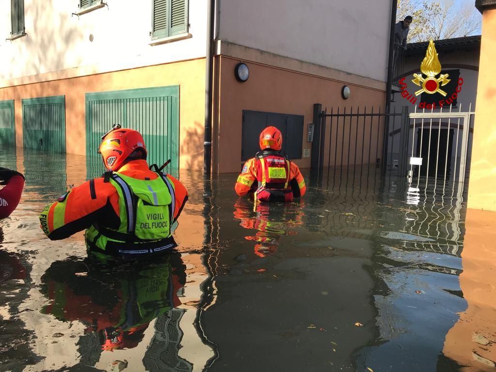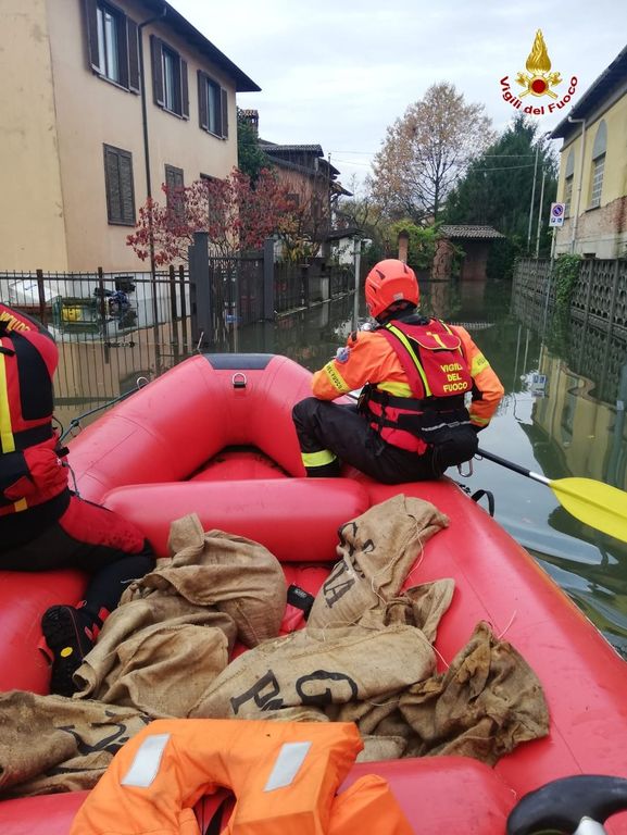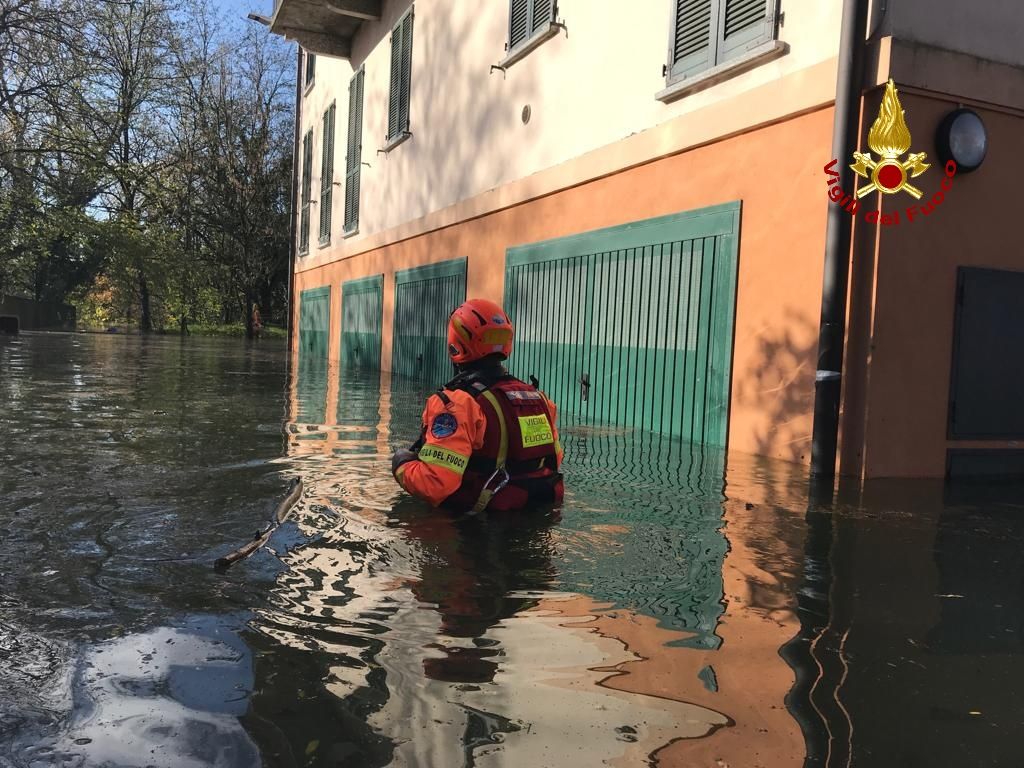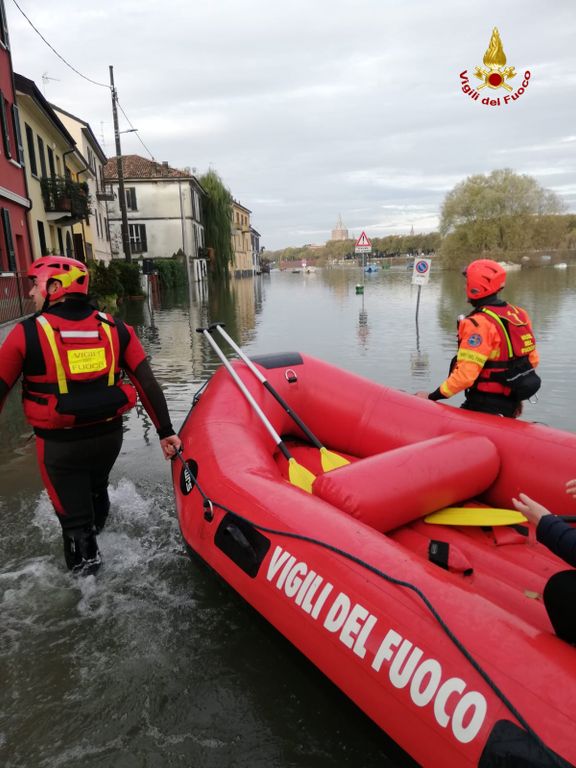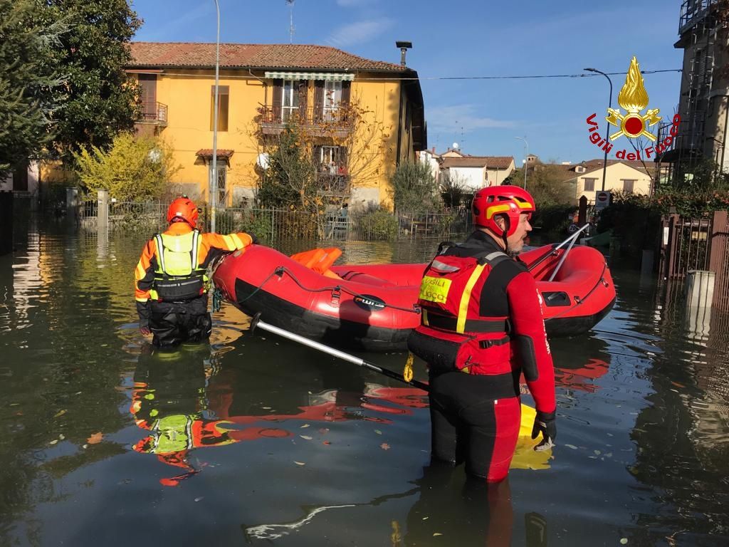 Con l’ausilio di un gommone, la squadra SAF in assetto fluviale, sta prestando soccorso a coloro che hanno necessità di allontanarsi dalle zone sommerse dall’acqua.