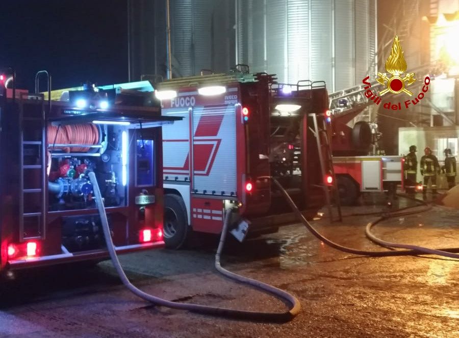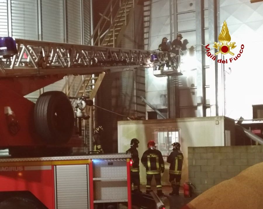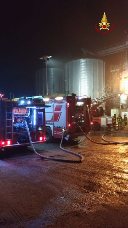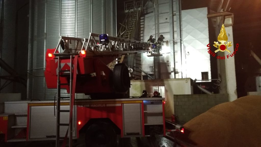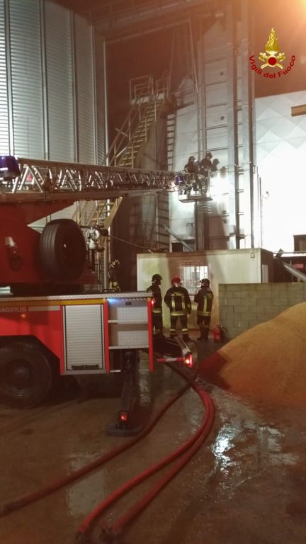 L'incendio ha interessato quello contenente circa 500 quintali di riso, l'origine delle fiamme è in via di accertamento, non si esclude che sia dovuta alla fermentazione del prodotto. Le squadre stanno monitorando con termocamera il contenitore, che sviluppa ancora calore nonostante le fiamme siano spente.