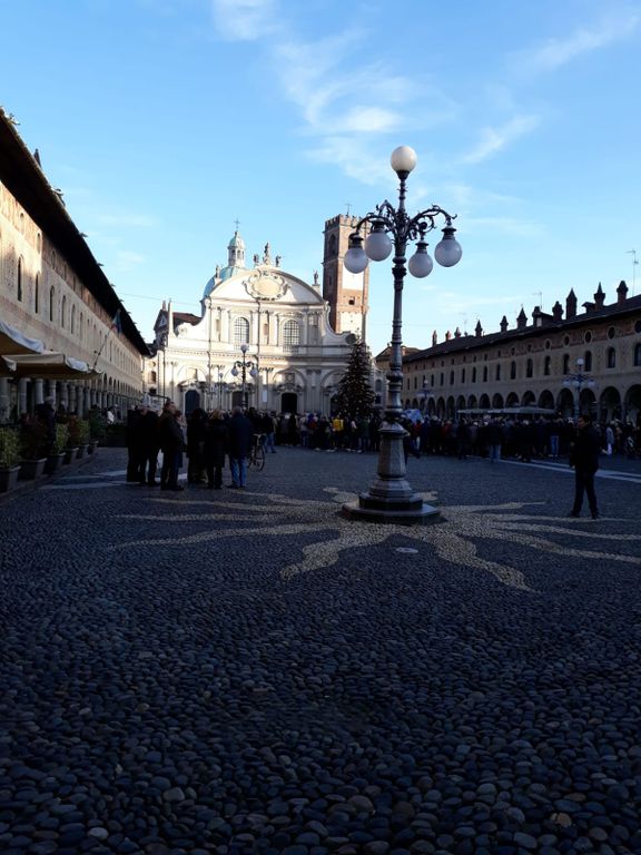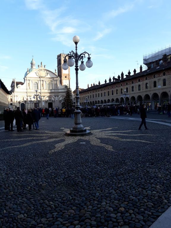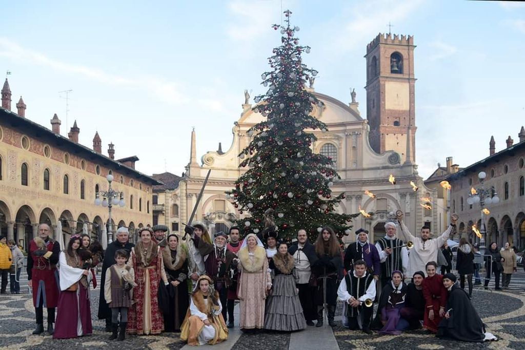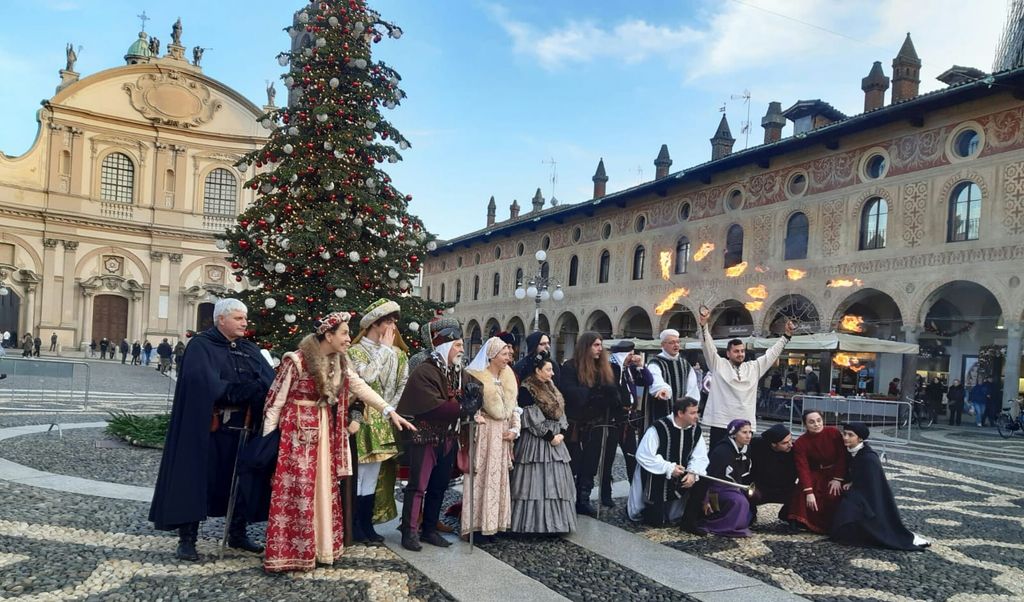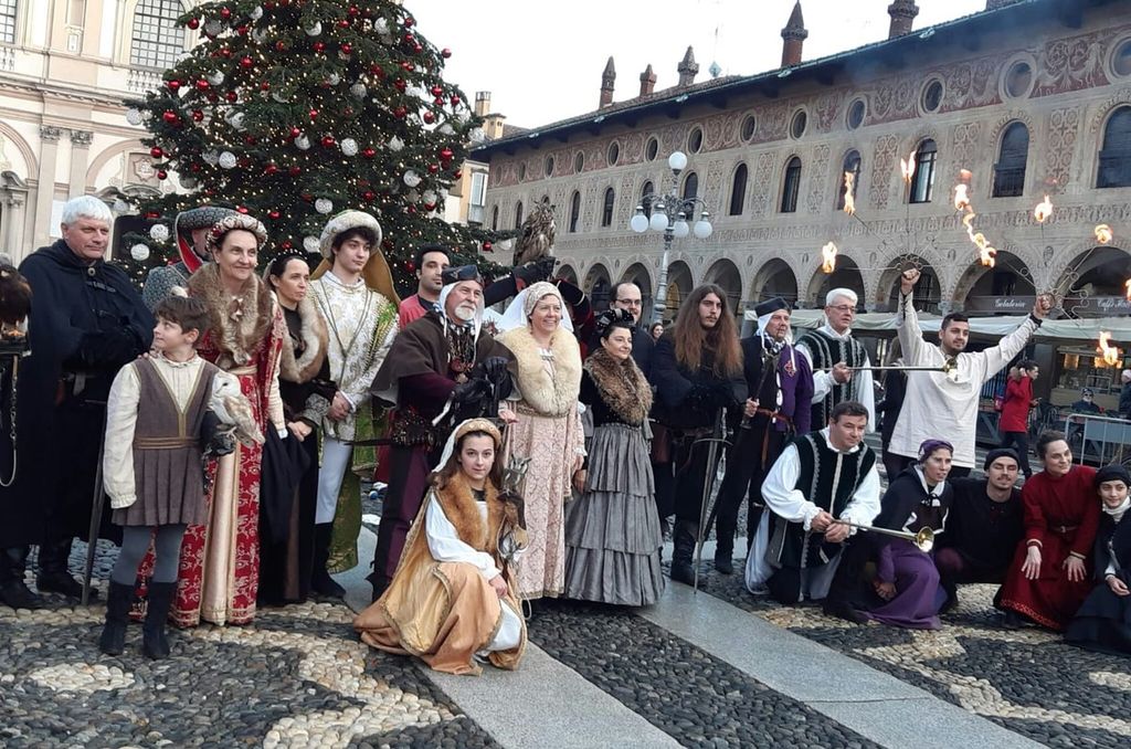 - (FOTONOTIZIA) - Vigevano: I musici e alfieri dell'Onda Sforzesca accolgono i turisti in piazza Ducale