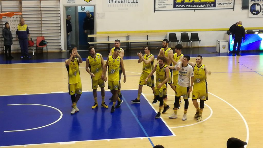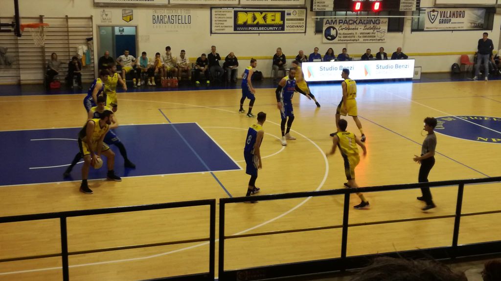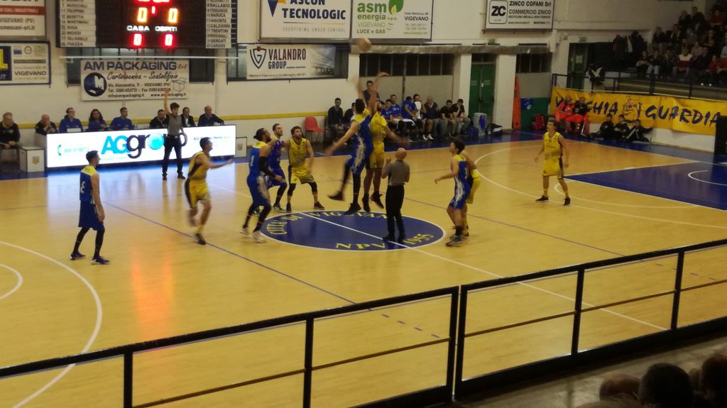 Vigevano deve fare a meno di Aromando, influenzato, ma finisce per trovare un Dell’Agnello stellare: 28 punti, con una percentuale da 11/12 al tiro da due punti, specialità della casa in cui ha sfoderato giocate spettacolari dimostrando un controllo del piede perno e una morbidezza di mano vicino a canestro da far spellare le mani all’esigente pubblico del PalaBasletta.