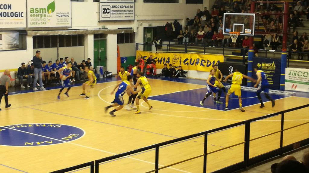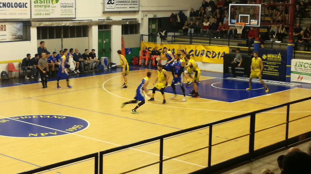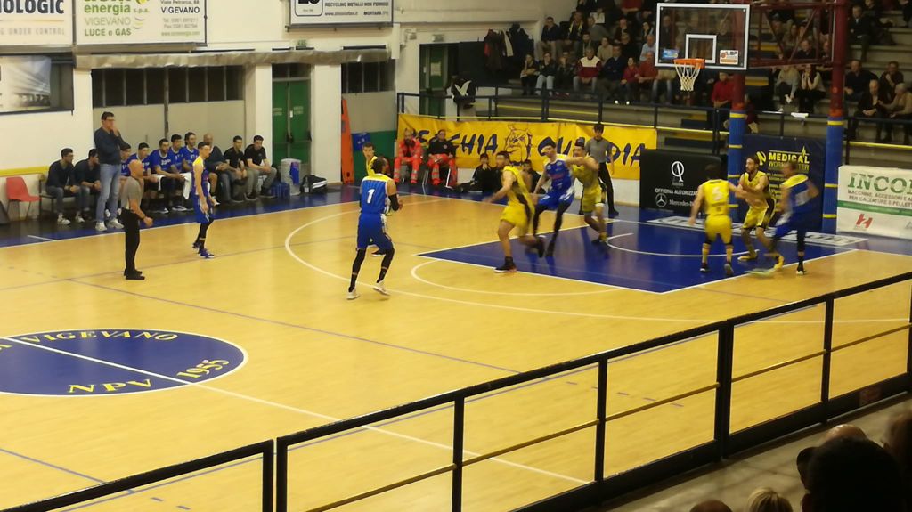 Nonostante l’assenza di lunghi in panchina, Piazza decide per il quintetto base, partendo con Filippini e Dell’Agnello insieme dall’inizio. Varese trova in avvio le triple di Gatti e Maruca, l’attacco di Vigevano prende subito posto sotto canestro con Filippini e Verri. Ballabio infila la tripla del +7 ospite, approfittando di una difesa ducale piuttosto morbida. Lo schiaffo fa bene alla Elachem, che inizia a metterci energia. Vigevano si prende l’inerzia della partita, e all’8’ un poderoso blocco di Dell’Agnello libera a Rossi l’autostrada per il 16-18. Sono due liberi di Brigato a dare il pareggio ai gialloblù, che riescono a sbrigare la pratica difensiva anche nei momenti in cui si trovano con un solo lungo in campo. Filippini, con un’azione caparbia, dà il primo vantaggio alla squadra di casa (22-21) in chiusura di quarto.