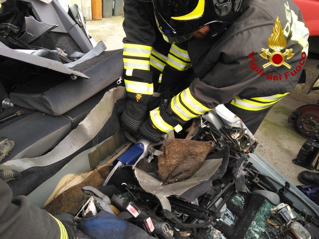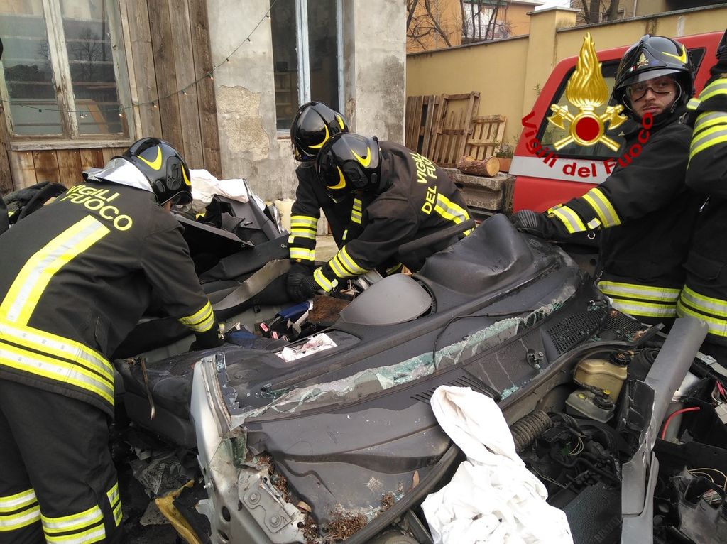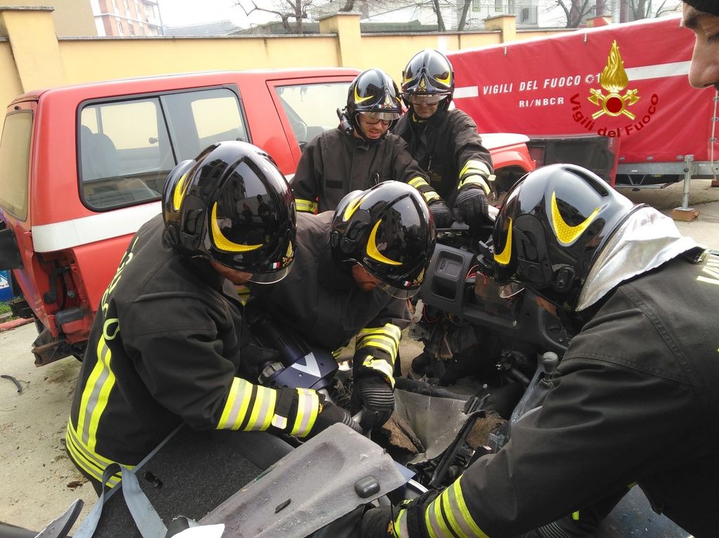 Questa mattina, dopo avere fatto i controlli degli automezzi del comando, i vigili del fuoco stanno collaudando il nuovo gruppo da taglio per incidente stradale, su una vettura destinata alla rottamazione.