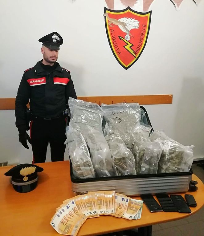 A seguito perquisizione, sono emersi i motivi che avevano indotto l’uomo a fuggire, poiché sul veicolo è stata trovata una valigia contenente complessivi kg. 7,62 di marjuana, nonché una somma contante di euro 1850, provento dell’illecita attività di spaccio.