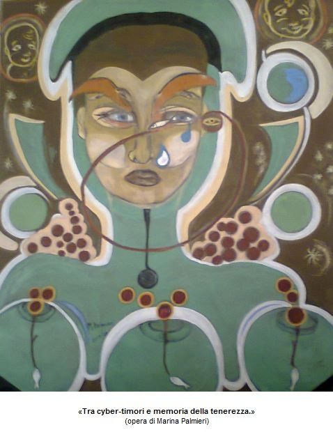 Una di queste – l’opera che nella mostra in corso di Marina Palmieri gioca un ruolo centrale – è «Tra cyber-timori e memoria della tenerezza.» (formato: circa 80x80 cm.); è un manufatto di “pensiero pittorico” dalle onde lunghe e che percorrono più tempi: le onde della memoria e, sì, della commozione per una tenerezza che è stato dato di conoscere e di attraversare, e nel contempo le onde in arrivo della svolta quasi antropologica in chiave cyber-tech, una svolta che attira ma può anche atterrire, con i timori e gli sgomenti che pressoché inevitabilmente, prima che poi, essa comporta per le intelligenze e le sensibilità più fini del genere umano.