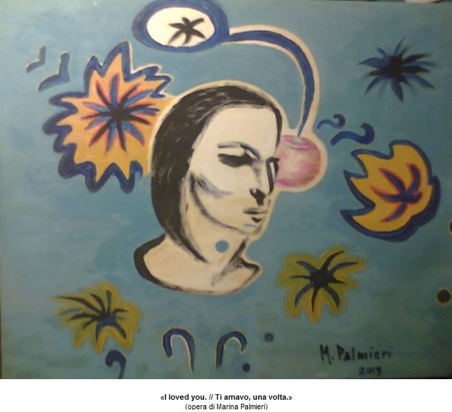 Sulla stessa linea visiva, troviamo «I loved you. // Ti amavo, una volta.»: qui, dalle considerazioni espresse dall’autrice, possiamo sottolineare di quest’opera sia l’emergere di un “istante di condensazione” che – già dallo stato d’animo che pare trasparire da un volto pensoso, racchiuso e molto pallido – rapprende e “ferma” i segni che sono stati resi centrifughi (ricollocati appositamente in moti di fuga dal soggetto centrale, ossia dal volto rappresentato nella parte centrale dell’opera), sia l’evidente “stacco” di cifra cromatica tra i diversi piani della raffigurazione.