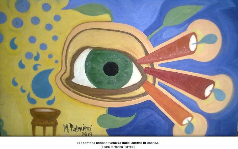 A fianco troviamo «La festosa consapevolezza delle lacrime in uscita.» ove, ancora, e in questo caso con insistita corposità colorica, rileva la proiezione mentale (e quindi “poi” – ovvero a seguito dell’aspetto mentale – abbiamo la proiezione medesima che si fa anche ‘raffigurativo-pittorica’) di un vissuto di “sollievo” attraversato con consapevolezza netta.