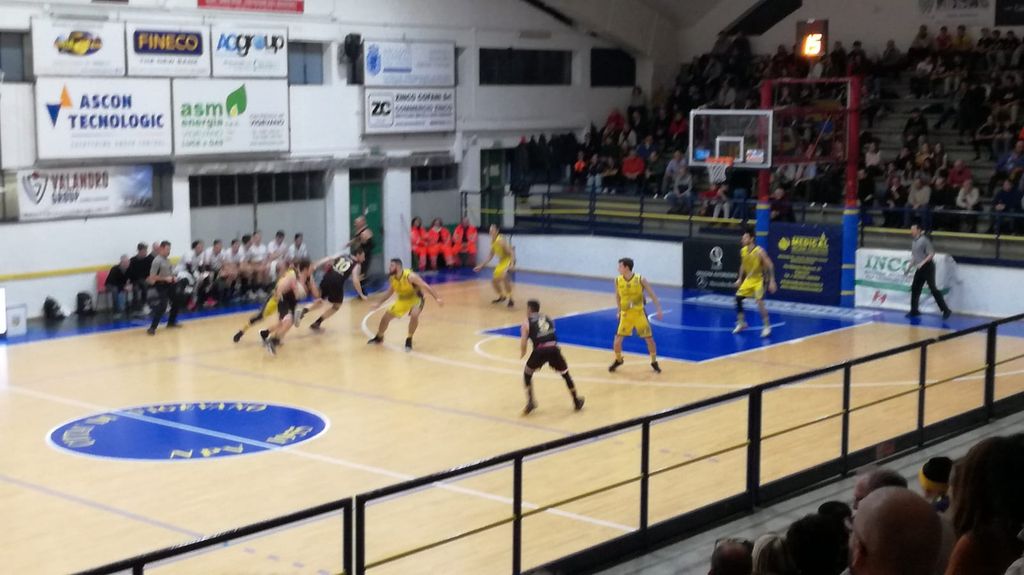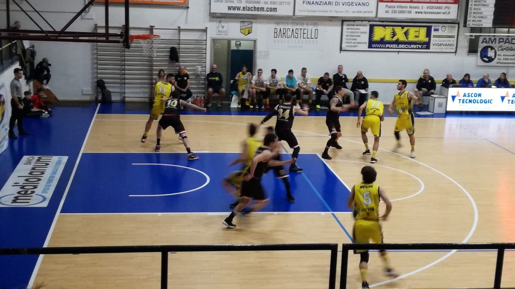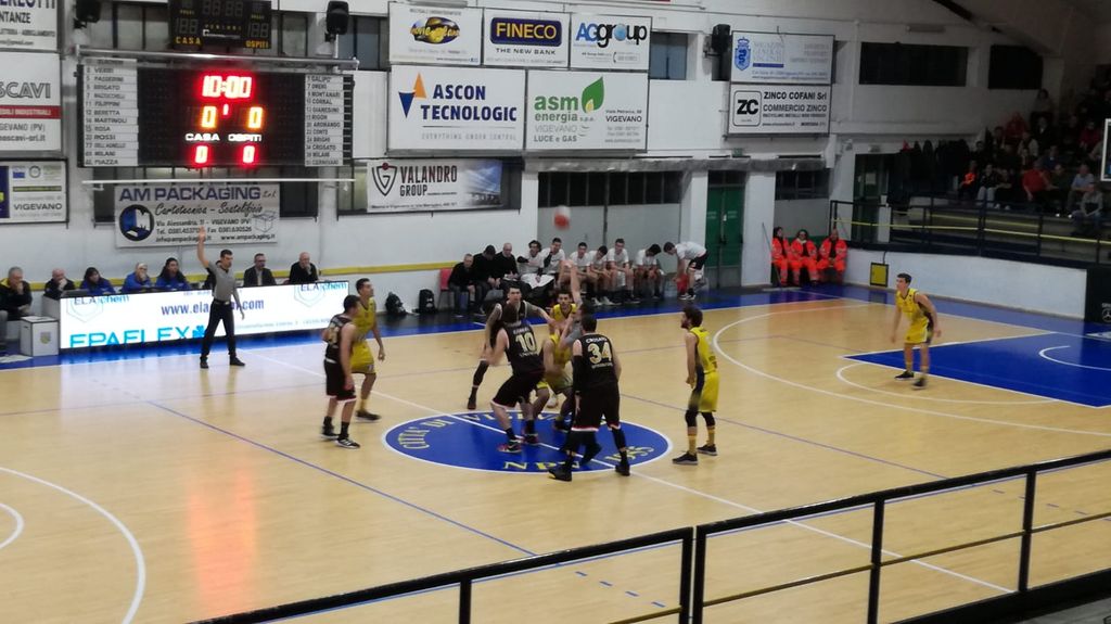 Vigevano parte subito bene, con Filippini e Dell’Agnello che segnano in avvicinamento a canestro. Risponde Crosato, sfidato al tiro dalla distanza. La Elachem prova l’allungo con una tripla inventata da Passerini, ma ancora Crosato si libera bene dalla distanza. Dopo 4’ si gira il ginocchio di Cervisani, portato a braccia nello spogliatoio. La sua partita finisce subito. Al 6’ il break vigevanese: un’ottima azione di Beretta porta allo scarico a Brigato libero dall’angolo, a seguire Dell’Agnello segna in transizione. Siamo sul 18-10. Cominciano le difficoltà per l’attacco di Vicenza, solo in parte dovute alla difesa gialloblù. Milani allunga il divario segnando da tre dopo un rimbalzo offensivo di Rossi. Striscia ulteriormente proseguita da un gioco di tre punti dello stesso Milani. Il canestro sulla sirena pescato da Mantovani tiene Vicenza in partita: 26-16 al primo mini-intervallo.
