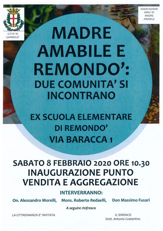 L’appuntamento è quindi per domani (sabato). Un’occasione che farà incontrare due comunità: da una parte Remondò e dell’altra Madre Amabile. Alla mattinata, a cui è ovviamente invitata la cittadinanza, parteciperanno l’onorevole leghista Alessandro Morelli, monsignor Roberto Redaelli e don Massimo Fusari. Al termine rinfresco per tutti i presenti.