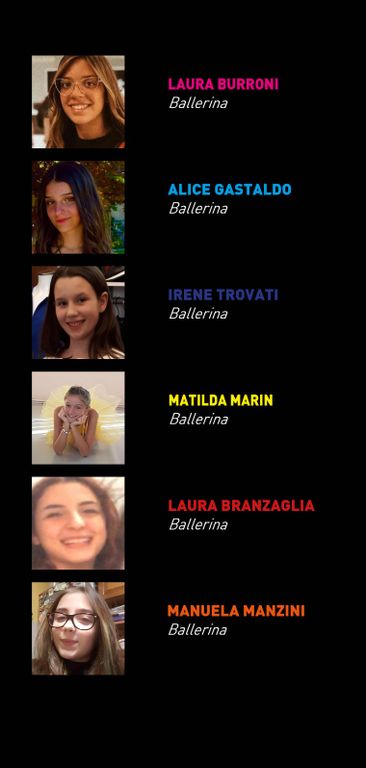 Ecco i ballerini e cantanti che si esibiranno sul palco: Laura Burroni (ballerina), Alice Gastaldo (ballerina), Irene Trovati (ballerina), Matilda Marin (ballerina), Laura Branzaglia (ballerina), Manuela Manzini (ballerina), Riccardo Busi (cantante), Alberto D’Onofrio (cantante), Maria Teresa D’Adamo (cantante), Ludovica Ferrari (cantante), Beatrice Capuzzi (cantante), Denise Nicolò (interprete).