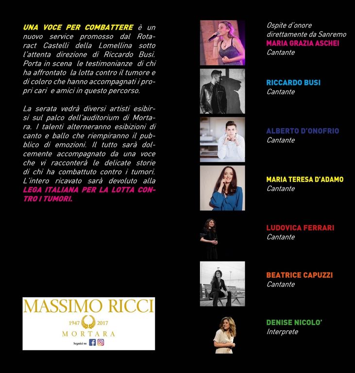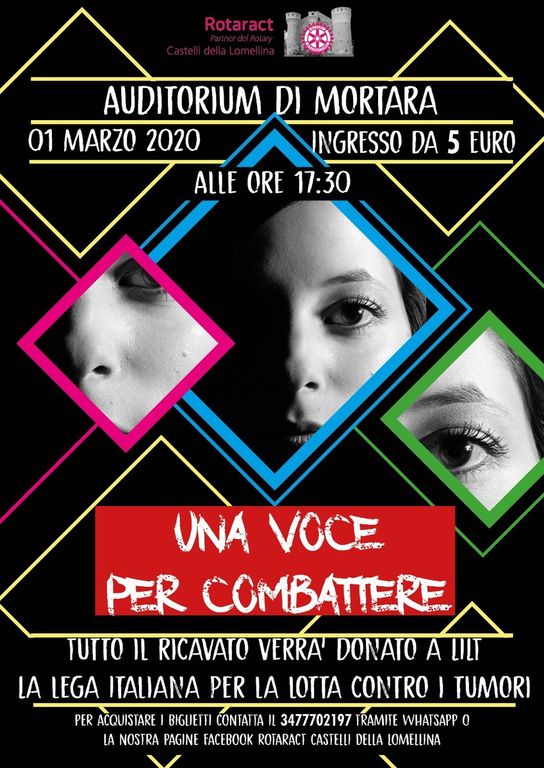 “Una Voce per Combattere” è il titolo del nuovo ed interessante service promosso dal Rotaract Castelli della Lomellina, sotto l’attenta e capace direzione di Riccardo Busi. Domenica 1 marzo alle 17.30 infatti il Club porterà in scena le testimonianze di chi ha affrontato la lotta contro il tumore e di coloro che hanno accompagnati i propri cari e amici in questo difficile e tortuoso percorso.