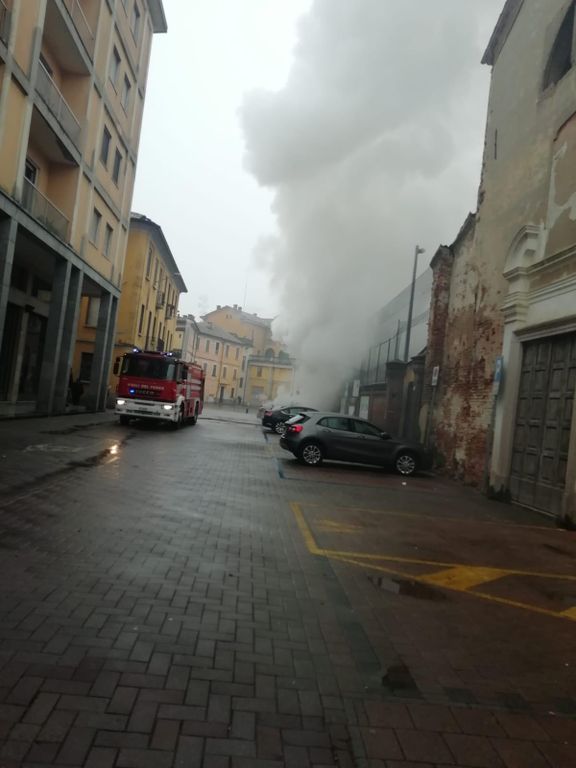 Mortara: in fiamme un'auto in piazza Olivelli, intervengono i vigili del fuoco