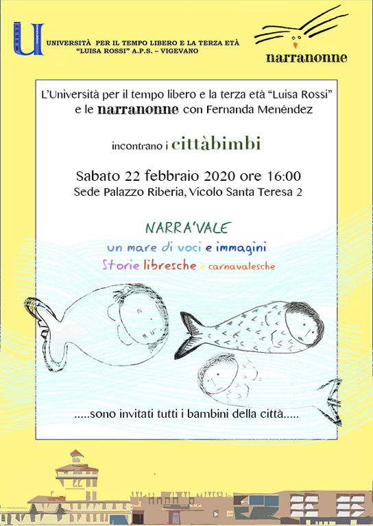 Si è costituito all'interno dell'Università per il tempo libero e la terza età "Luisa Rossi" di Vigevano il gruppo delle Narranonne, coordinato da Fernanda Menendez, docente Unitre.Il gruppo è nato dopo un percorso di formazione propedeutico e conta già con diversi interventi in scuole Materne ed Elementari.Le Narranonne hanno una voce, cercano di riconoscerla narrando e narrandosi…. e organizzano una serie di incontri rivolti a tutti i bambini della città, il primo dei quali sarà sabato 22 febbraio ore 16 in Vicolo santa Teresa 2, col titolo di Narra'vale (storie libresche carnevalesche). Per l’occasione sarà inaugurata una piccola Biblioteca.