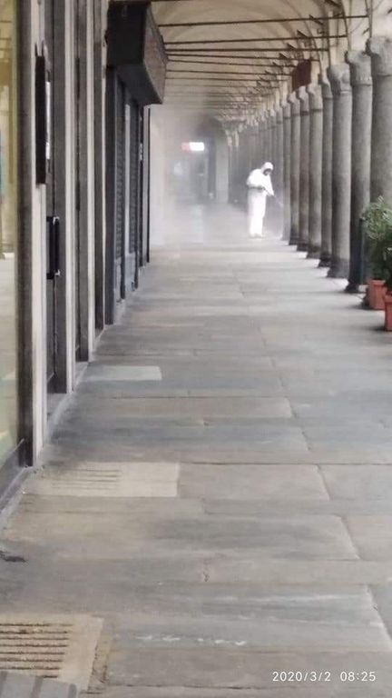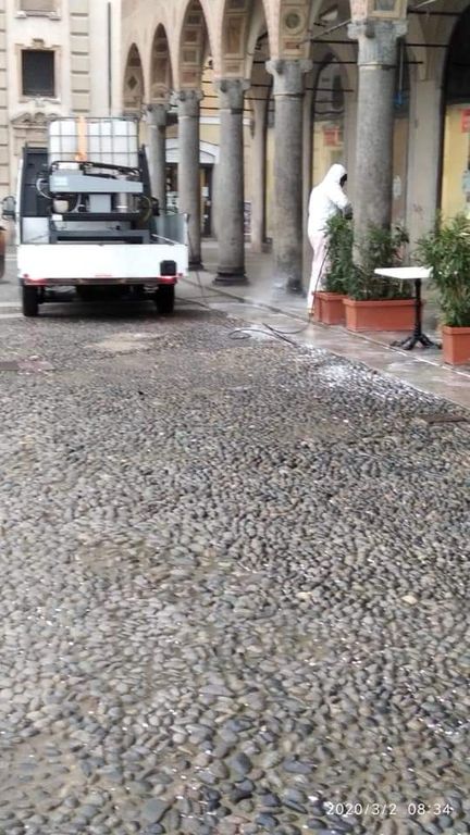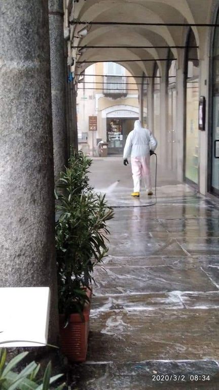 Gli operatori da questa mattina (lunedì) stanno utilizzando prodotti disinfettanti. Foto tratte dalla pagina Facebook del "Gruppo Civico Vigevano"