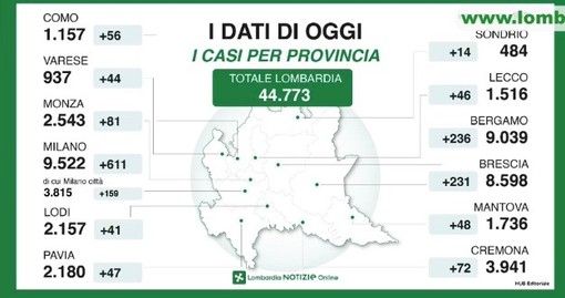 Milano: 9522 (+611), di cui 3815 (+159) a Milano città