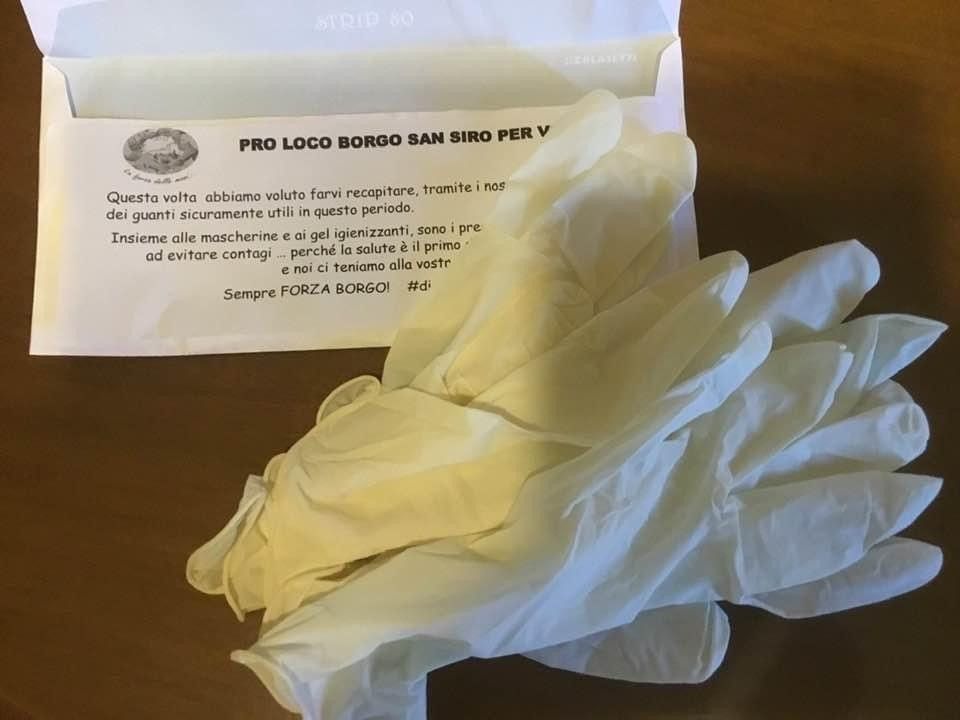 La Pro loco di Borgo San Siro, guidata dalla presidente Viviana Rossi, dopo aver donato alla cittadinanza i gel igienizzanti, ha fatto recapitare dai volontari, a tutte le famiglie del comune, due paia di guanti utili in questo periodo di emergenza sanitaria.