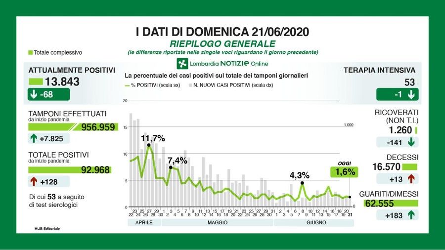 Ecco nel dettaglio i numeri di oggi, domenica 21 giugno, in Lombardia: