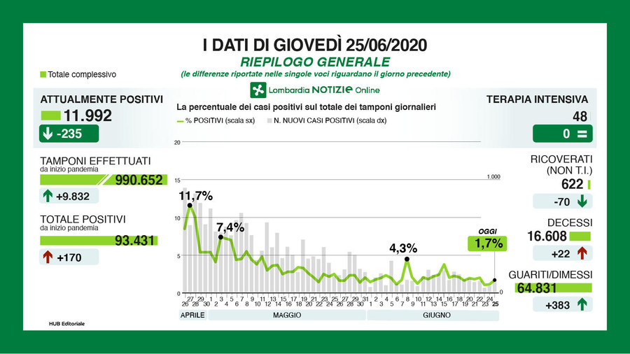 Di seguito il riepilogo dei dati di oggi giovedì 25 giugno.
