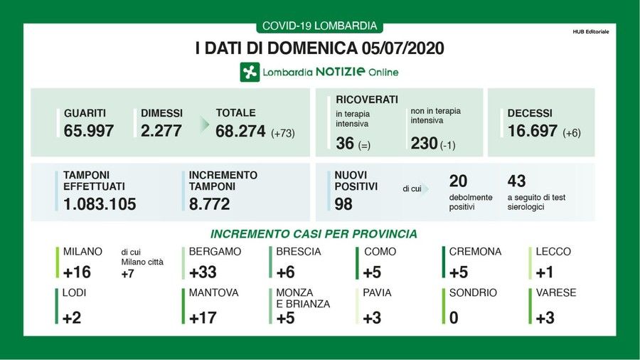 Ecco il riepilogo dei dati di oggi, domenica 5 luglio, in Lombardia