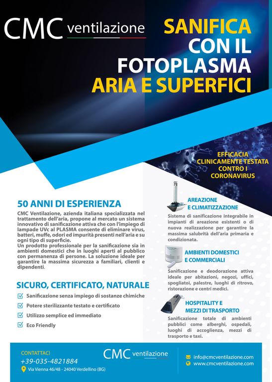 A segnare il passo nella giusta direzione è CMC Ventilazione, azienda italiana al 100%, che ha introdotto nel mercato un sistema innovativo di sanificazione, combinando la propria competenza nella progettazione e realizzazione di impianti con il potere sanificante delle lampade UVc al Plasma (fotoplasma).