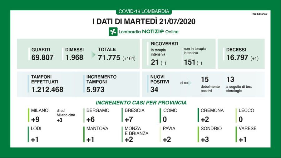 Ecco il riepilogo dei dati di oggi, martedì 21 luglio, in Lombardia: