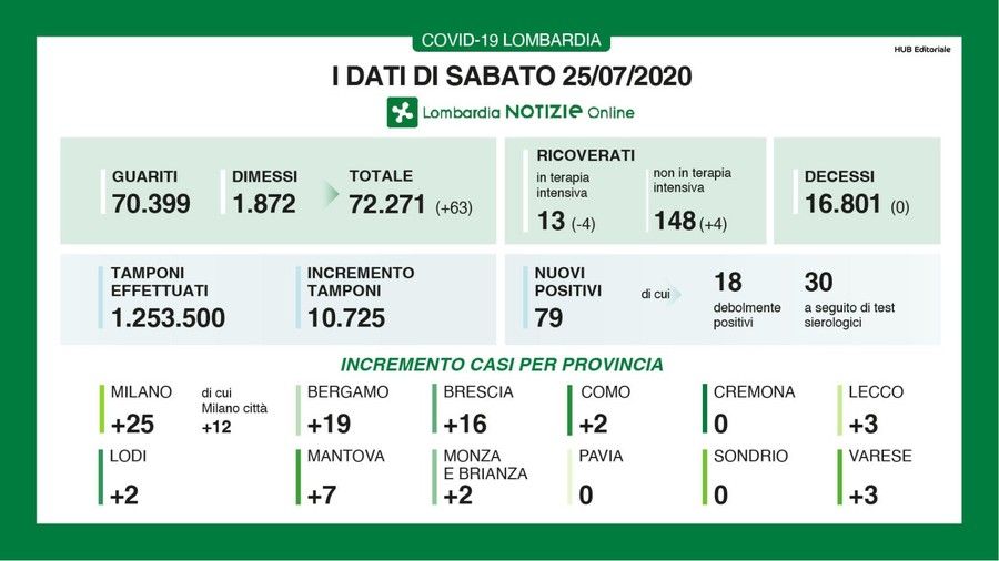 Ecco i dati di oggi, sabato 24 luglio, in Lombardia: