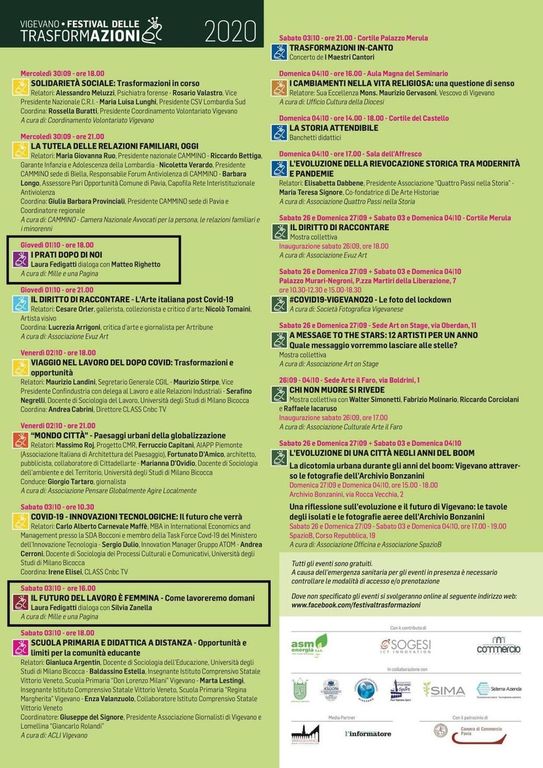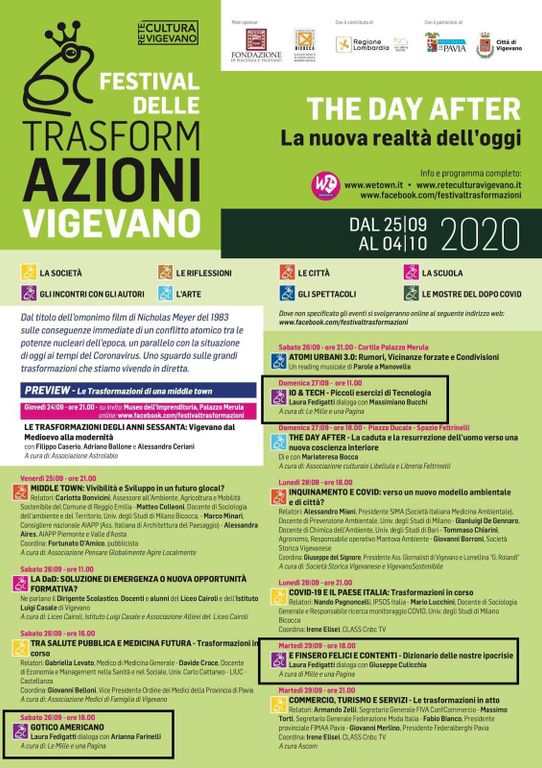 Non necessariamente le trasformazioni in corso saranno negative, il nuovo mondo sarà diverso, certo, ma ancora da scoprire. Il Festival delle Trasformazioni 2020, ispirandosi al titolo e al tema dell’omonimo film di Nicholas Meyer del 1983 - THE DAY AFTER - sulle conseguenze immediate di un conflitto nucleare, utilizzando proprio i nuovi mezzi di comunicazione, vuole lanciare uno sguardo alle grandi trasformazioni in corso, dal lavoro alla famiglia, dalle città alla scuola e alla cultura. Niente sarà come prima.