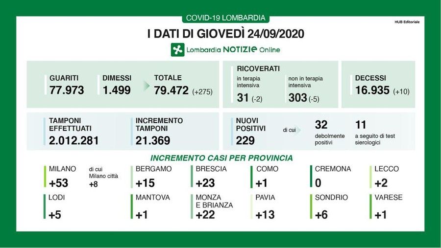 Ecco il riepilogo dei dati di oggi, giovedì 24 settembre, in Lombardia: