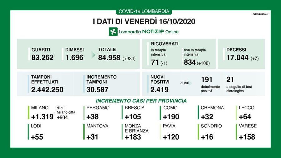 Ecco il quadro completo dei dati di oggi, venerdì 16 ottobre, in Lombardia e il dettaglio provincia per provincia: