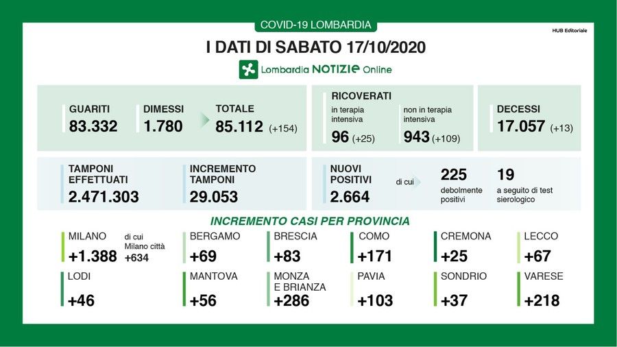 Ecco il quadro completo dei dati di oggi, sabato 17 ottobre, in Lombardia e il dettaglio provincia per provincia: