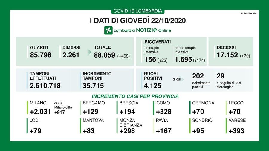 Ecco il quadro completo dei dati di oggi, giovedì 22 ottobre, in Lombardia e il dettaglio provincia per provincia: