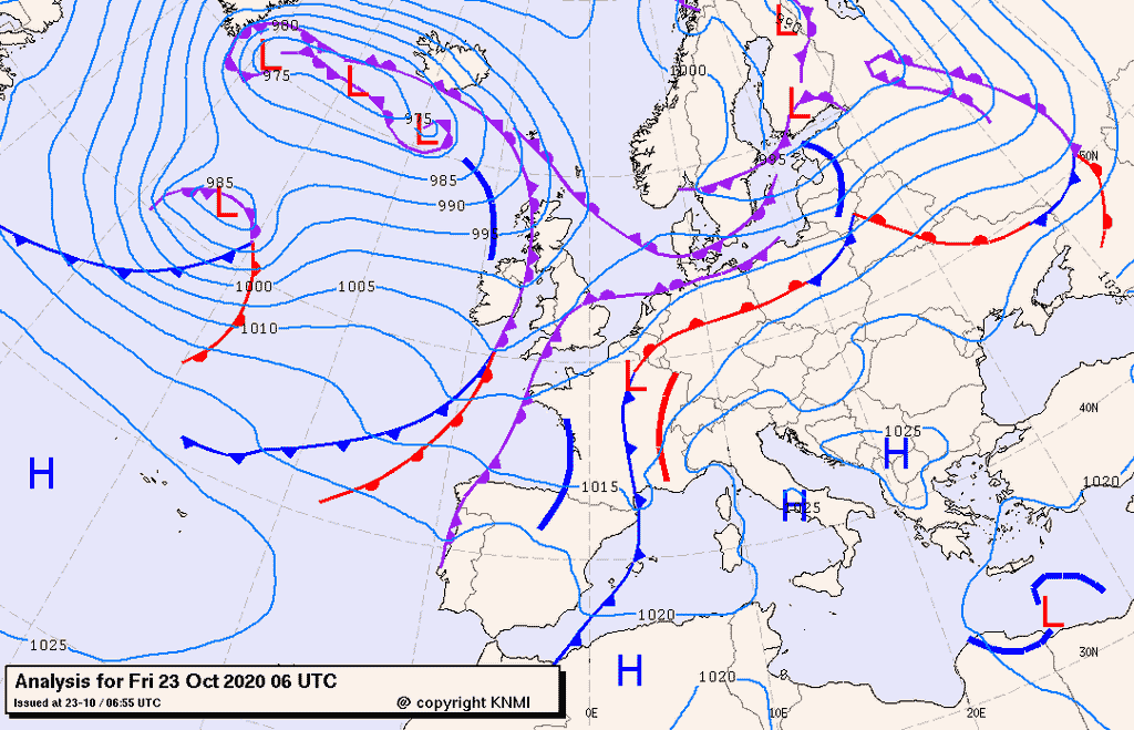 La saccatura atlantica che ha interessato le zone occidentali europee nei giorni scorsi, si muove verso levante, accompagnata da un debole sistema frontale che attraversa il Nord Italia nella giornata odierna, venerdì 23 ottobre.
