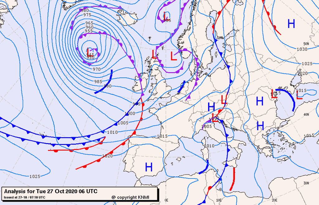 Tutta la penisola italiana si trova sotto l'influenza dell'estesa saccatura che, dalle latitudini polari, si protende sin sulle coste africane. La presenza della saccatura consentirà l'afflusso da nord di aria fredda ed un richiamo, nei bassi strati, di aria caldo umida proveniente da sud. Le nostre regioni centro-meridionali saranno soggette a fenomeni convettivi lungo le coste e sui rilievi appenninici, mentre sulle regioni nord-occidentali, avremo una graduale risalita dei valori pressori ed una stabilizzazione delle condizioni del tempo. Sulla Lombardia residua instabilità durante la prima parte della giornata associata a locali precipitazioni, nevose a quote superiori ai 1500 mt, ed una graduale attenuazione dei fenomeni e della nuvolosità, dalla seconda parte della giornata. Condizioni di tempo stabile e mite, con locali nebbie mattutine e serali, ci accompagneranno almeno sino alla prima settimana di Novembre.