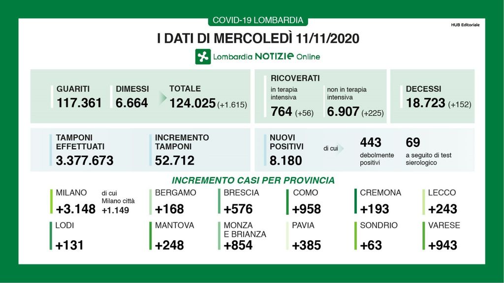 Ecco il quadro completo dei dati di oggi, mercoledì 11 novembre, in Lombardia e il dettaglio provincia per provincia.